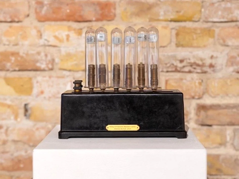 The starting point was the attest you are human dice, which I wanted to incorporate into a machine, something mechanical that mirrored the subject robot / bot subject matter. Through my research I found some fascinating early 20th century dice poppers or ‘trade stimulators’ as they were sometimes called. The kind of thing that you would find in a grocery store or bar in the 1920’s. I had used antique one arm bandits in ULO and other attest you are human works and I loved the mechanical / humanity hybrid play. Plus the tubes resembled test tubes, a visual reference to the experimentation that is taking place in the test tubes of biotechnology.